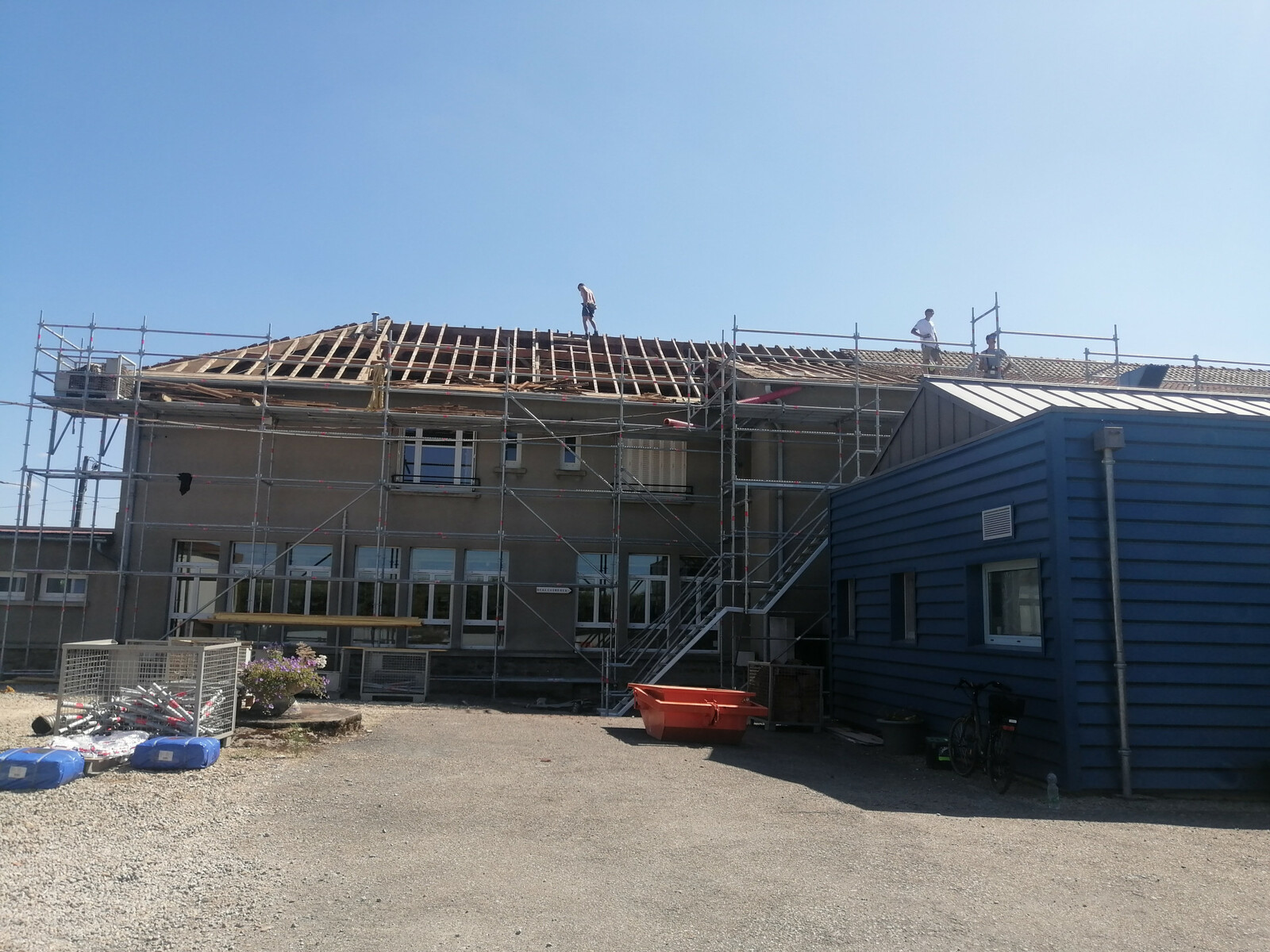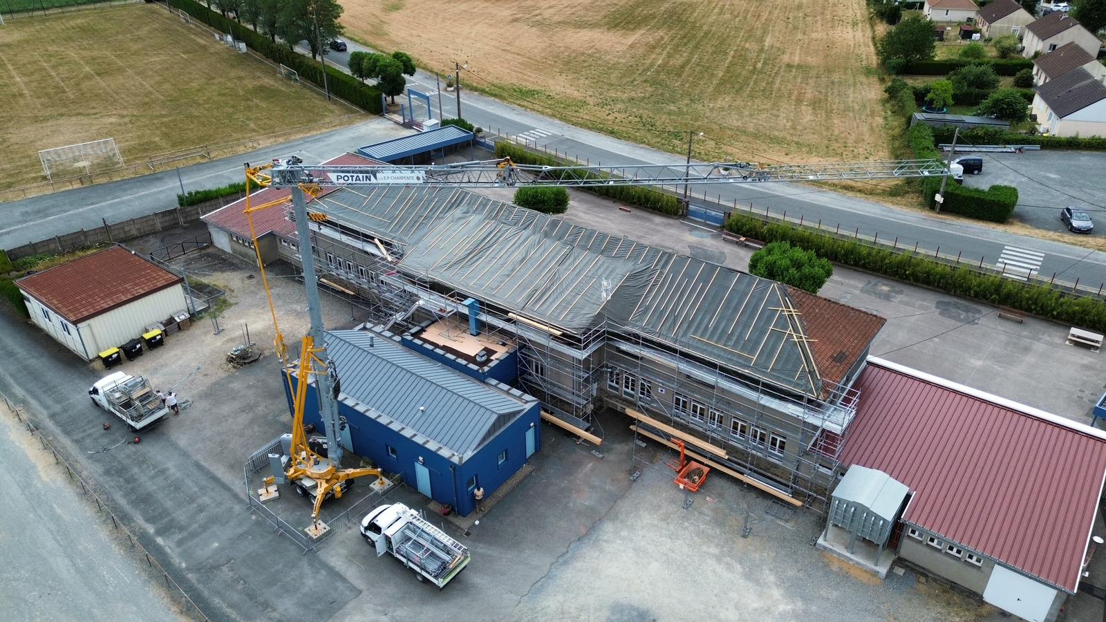 Réfection de la toiture et de consolidation de la charpente La toiture de l’école date de 1956, année de construction du bâtiment. La partie centrale du pan nord est très abîmée, du fait de sa faible pente qui ne permet pas une évacuation correcte de l’eau, ce qui favorise l’apparition de mousse et fragilise les tuiles avec le gel. En conséquence, des infiltrations ont été constatées et plusieurs interventions ont été réalisées ces dernières années pour réparer cette partie de la toiture. Les infiltrations ont été réduites mais se produisent encore par forte pluie et par vent fort. Par ailleurs, un diagnostic a été réalisé suite au constat de fissures en façade sous la charpente. Une demande de subvention a été acceptée pour un financement à hauteur de 70% du coût des travaux. Les travaux ont débuté début juillet.