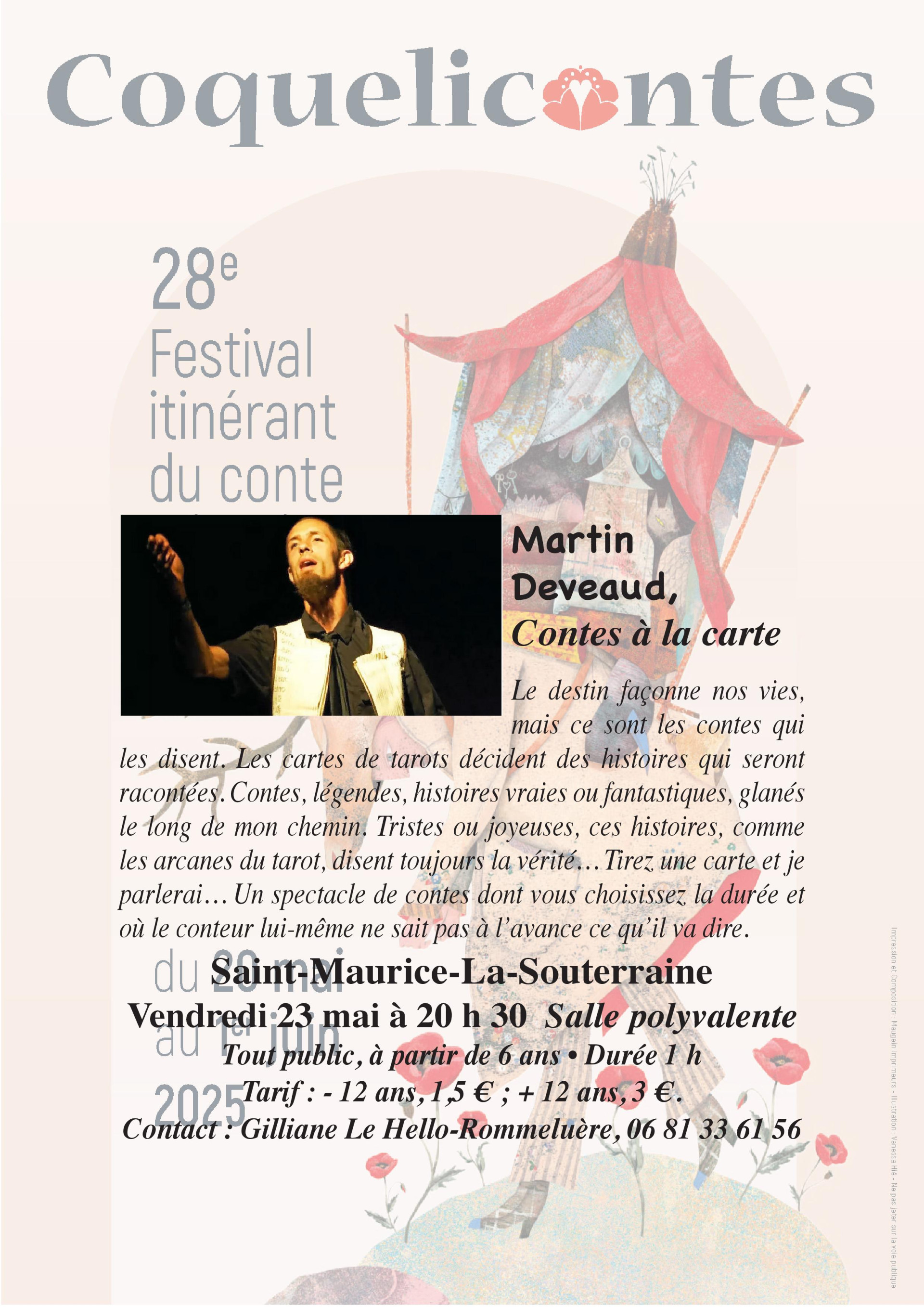 Le 28ème festival itinérant Coquelicontes passera par Saint-Maurice-la-Souterraine le vendredi 23 mai pour son spectacle "Contes à la carte" à 20h30 à la salle des fêtes.Tout public, à partir de 6 ans, cf. Affiche jointe.
