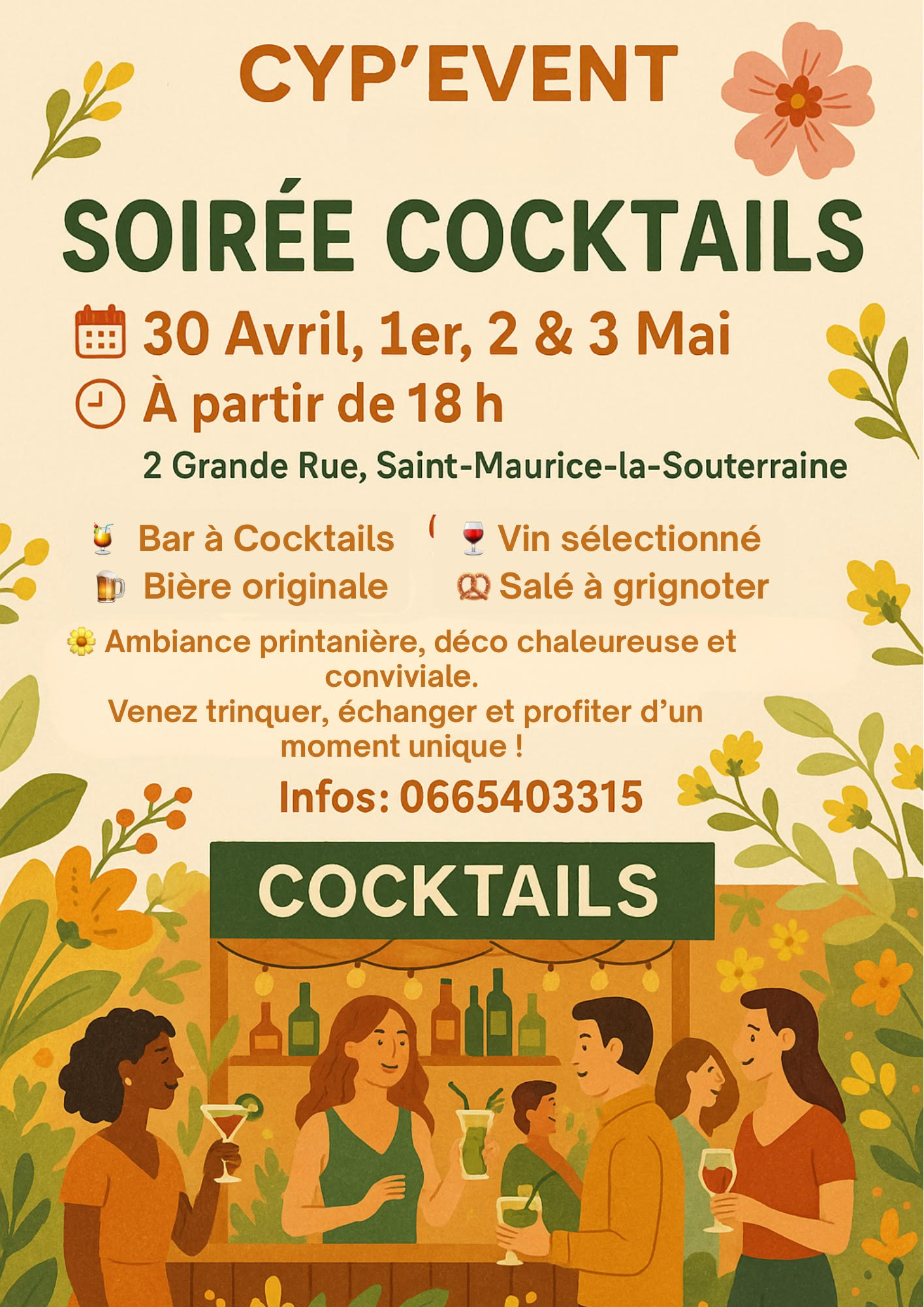 De nouvelles soirées cocktails sur le thème du printemps seront organisées par Cyp'Event les mercredi 30 avril, jeudi 1er mai, vendredi 2 mai et samedi 3 mai à partir de 18h au bar 22 Grand'Rue.