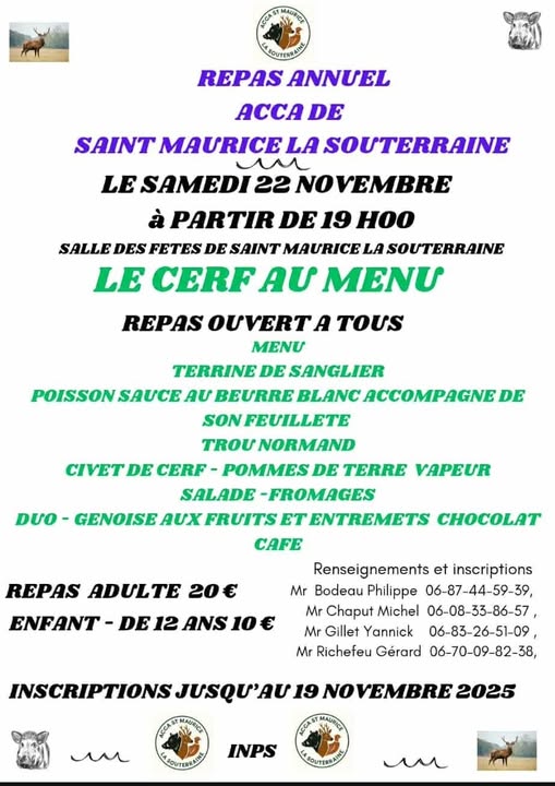 L'ACCA organise son repas annuel le samedi 22 novembre à partir de 19h à la salle des fêtes.